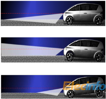 自調(diào)平系統(tǒng)中的調(diào)平傳感器向電子控制單元(ECU)發(fā)送關(guān)于汽車傾斜的信息,而調(diào)平控制單元利用剎車或油門踏板的應(yīng)用提示、速率變化、懸掛行程和壓力等線索智能地濾除傳感器數(shù)據(jù),同時計算傾斜度,然后前大燈據(jù)此信息向上或向下移動以便駕駛員在不平坦的地形或剎車時糾正車距的變化,或在檢測到迎面而來的汽車時自動將大燈遠光調(diào)為近光以防止眩光影響。如圖一的上中下三圖,分別展示了汽車在正常水平條件下、向后傾斜和向前傾斜的照明效果。
