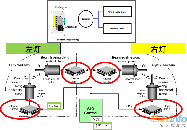 步進電機驅(qū)動器在自適應(yīng)前大燈系統(tǒng)中發(fā)揮關(guān)鍵作用。如圖三所示,在左右前大燈里各有兩個步進電機:一個在垂直面控制調(diào)節(jié)大燈高度,一個在水平面控制調(diào)節(jié)光束的旋轉(zhuǎn)。與前大燈的調(diào)平系統(tǒng)和各調(diào)平傳感器的通信經(jīng)由汽車數(shù)據(jù)網(wǎng)絡(luò)系統(tǒng)傳輸??刂破骶钟蚓W(wǎng)絡(luò)(CAN)總線用于收集和分發(fā)傳感器數(shù)據(jù),局域互聯(lián)網(wǎng)絡(luò)(LIN)總線用于控制前大燈。