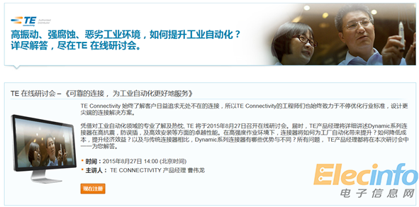 [中國–2015年8月12日]e絡盟日前宣布將攜手全球連接器產品領先供應商TE Connectivity(TE)舉辦在線研討會。研討會將集中探討適用于自動化、控制、工業(yè)機械和設備等應用的連接解決方案,其中包括機器人、工業(yè)流程控制及運動控制等。該研討會將于2015年8月27日正式召開。