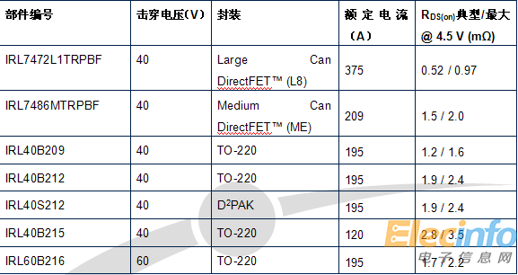 新器件保留了StrongIRFET系列的典型性能特色:低導通電阻(如下IRL7472L1TRPBF,典型值只有0.52m?和最大值是0.97m?)降低導通損失;高載流能力提高功率容量以及耐用硅晶片,所有這些特性共同提升了系統(tǒng)高可靠性。