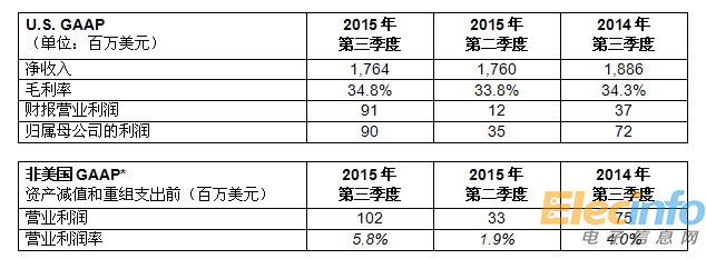 2015年第三季度,凈收入總計(jì)17.6億美元,毛利率為34.8%,扣除減值重組支出,營(yíng)業(yè)利潤(rùn)率為5.8%,凈利潤(rùn)9000萬(wàn)美元,自由現(xiàn)金流為正8500萬(wàn)美元。