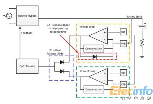 第一個(gè)例子是一款電池充電器——其輸出電流在快速充電期間被調(diào)節(jié)到一定的電平。之后則主要由一個(gè)電壓環(huán)路來調(diào)節(jié)電池電壓。圖1展示了隔離反激式電池充電器的方框圖。