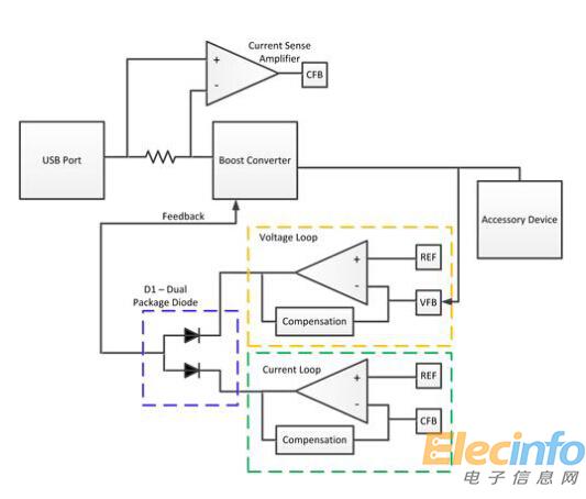 第二個(gè)例子來自一種升壓型轉(zhuǎn)換器——該轉(zhuǎn)換器專為從USB端口獲取功率而設(shè)計(jì)。USB端口可為不同類型的接口提供500mA、1A、1.5A甚至高達(dá)3A的電流。如果一種配件試圖汲取過大的電流,那么它會(huì)使總線超載并導(dǎo)致端口過熱或關(guān)斷主機(jī)設(shè)備。一種原始的方法是:在減小負(fù)載電流之前監(jiān)測輸入電壓并等待它降到低于某一閾值。這種方法雖然可行,但并不理想。如果該端口包含一個(gè)USB開關(guān),那么這種方法可能導(dǎo)致該端口連續(xù)復(fù)位。如果電流不受限制,那么它會(huì)導(dǎo)致要獲取的功率超過主機(jī)可支持的范圍。解決這一問題的另一種方法與我們的電池充電器示例非常相似。但是,這一次我們將調(diào)節(jié)輸入電流和輸出電壓。圖2展示了輸入電流受限制的升壓型轉(zhuǎn)換器的方框圖。