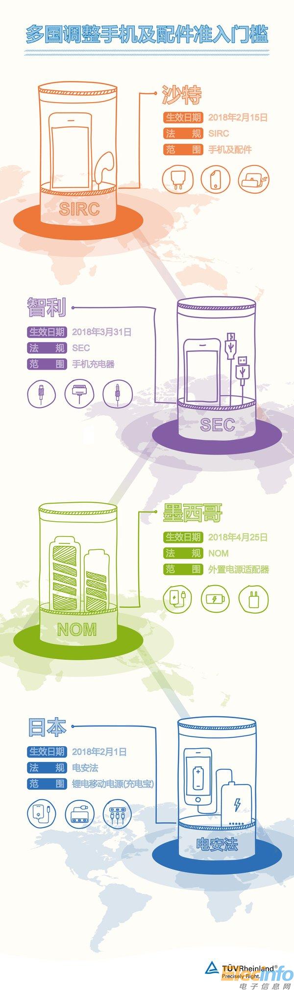 進入2018年,沙特、墨西哥、智利、日本先后調(diào)整了手機及手機配件的市場準入政策,這類型產(chǎn)品都被劃歸當(dāng)?shù)貜娭普J證范圍。德國萊茵TUV助力企業(yè)解讀相關(guān)驗證。