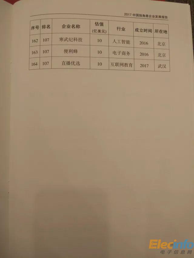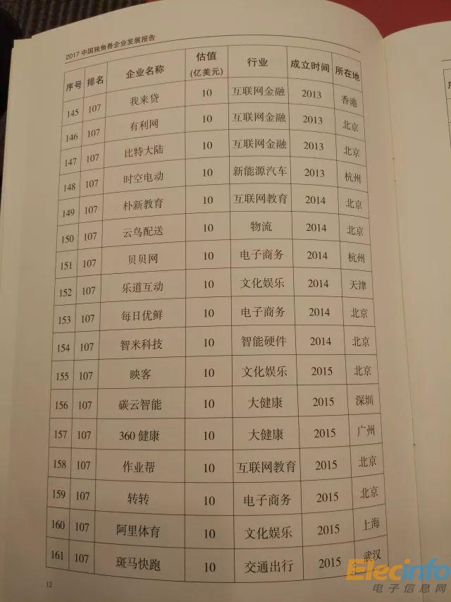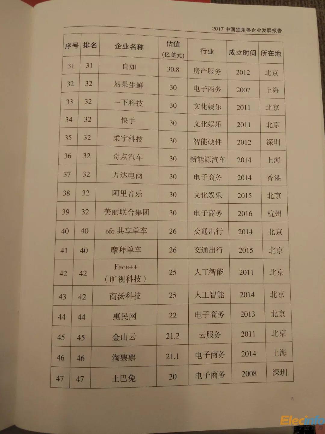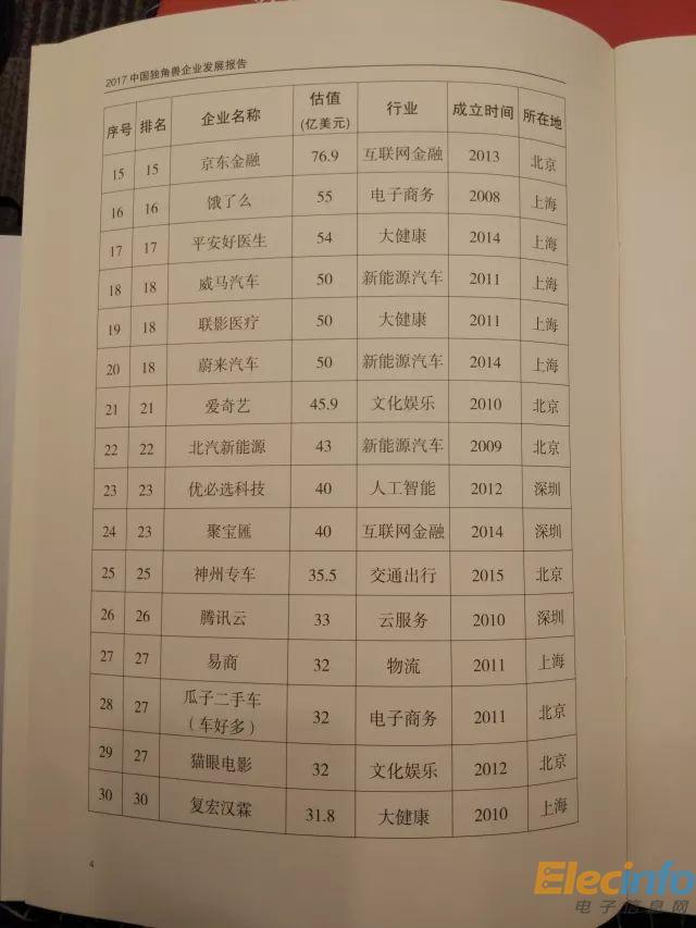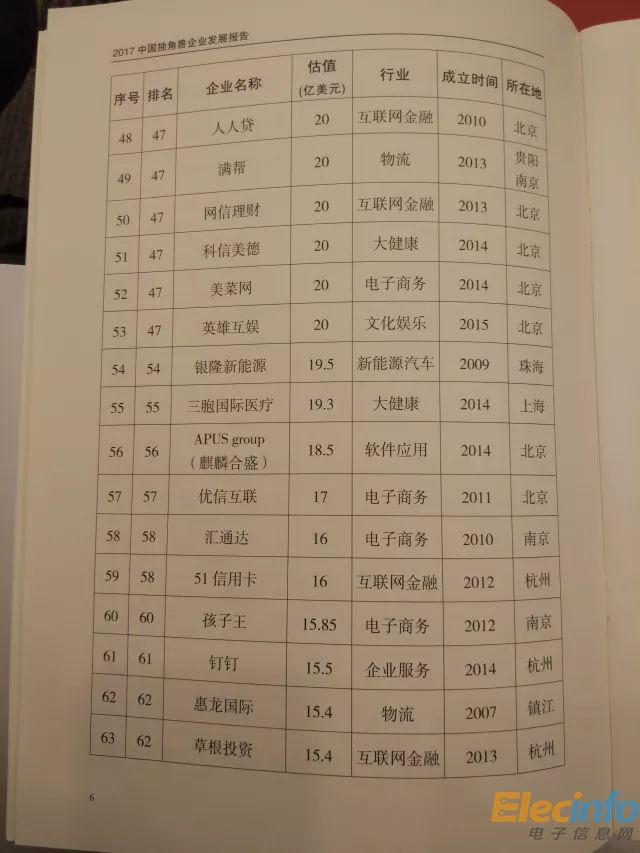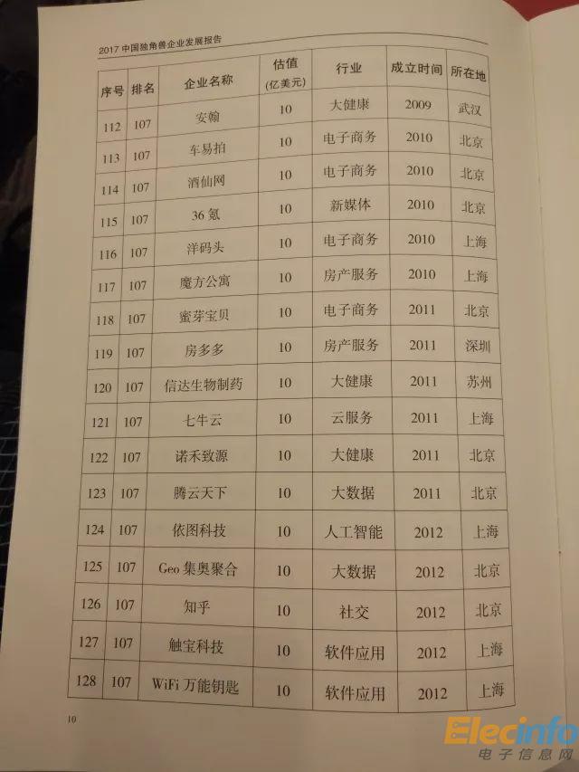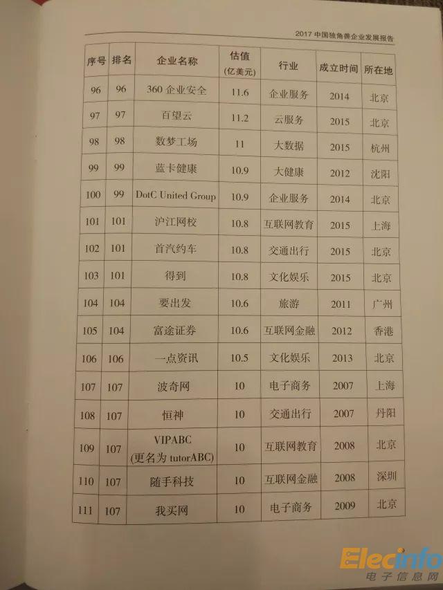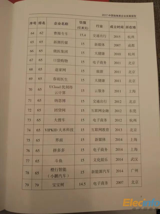 科技部 2017年中國獨(dú)角獸企業(yè)榜單