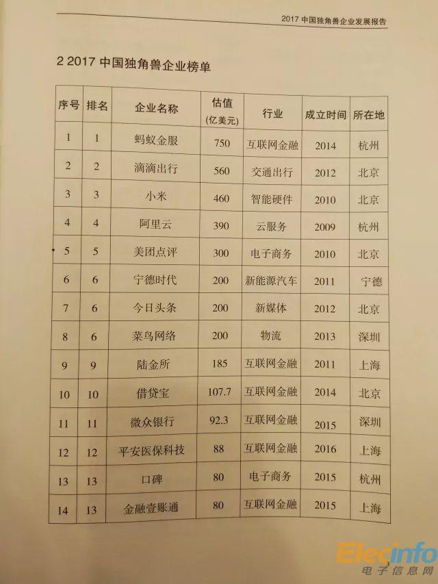 科技部發(fā)布2017年中國獨(dú)角獸企業(yè)榜單