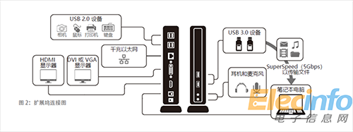 圖 1:擴(kuò)展塢提供了高清顯示輸出和 USB 接口用于鼠 標(biāo)、鍵盤(pán)和其它外設(shè)