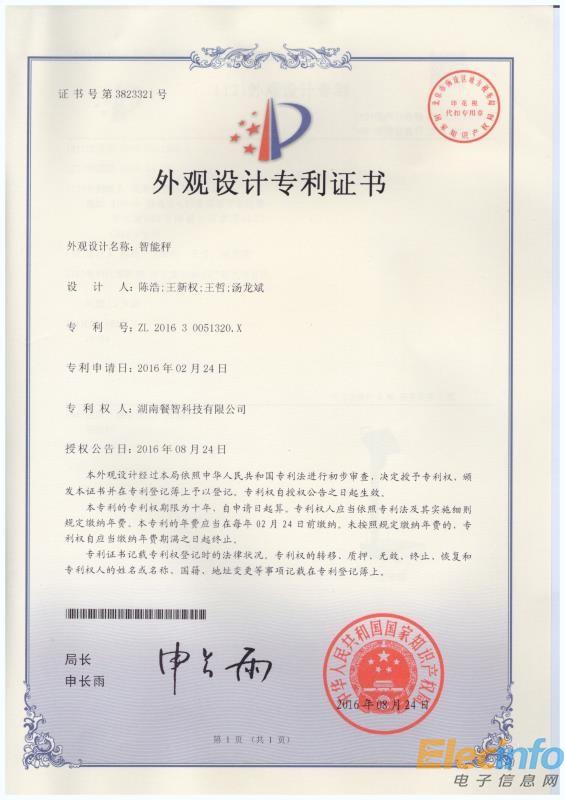 餐鏈智能秤2016年2月申請外觀設計專利成功