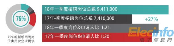 中國最大的人力資源服務(wù)商前程無憂(NASDAQ: JOBS)近日發(fā)布《2018年一季度招聘供需》。數(shù)據(jù)顯示,2018年一季度雇主發(fā)布的招聘崗位總數(shù)共9,411,000多個,是2017年同期的127%。2018年崗位與申請人比1:21,2017年同期為1:20。1989年、1990年與1994年出生人群為新增求職主力軍。互聯(lián)網(wǎng)/電子商務(wù)行業(yè)繼續(xù)牢牢占據(jù)崗位需求量榜首。民營企業(yè)的一季度新增招聘需求超過了上市公司、國企、外資(歐美/非歐美)與政府/事業(yè)單位之和。