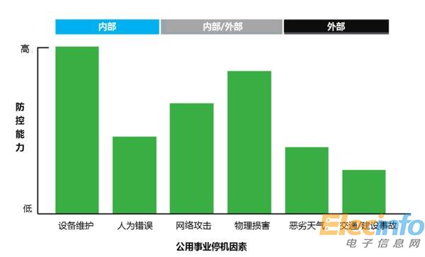 公用事業(yè)部門的停機(jī)事件由內(nèi)部和外部因素共同驅(qū)動(dòng)。內(nèi)部因素引起的停機(jī)事件通常由人為錯(cuò)誤或技術(shù)故障造成;外部因素驅(qū)動(dòng)的停機(jī)事件則通常由惡劣天氣、隨機(jī)事故和蓄意破壞(通過網(wǎng)絡(luò)或物理手段)引起。而對(duì)內(nèi)部停機(jī)因素的控制能力,要比外部因素相對(duì)容易。目前,在“易于控制”內(nèi)部防控方面,公用事業(yè)部門正努力改進(jìn)流程,消除單點(diǎn)故障并強(qiáng)調(diào)內(nèi)部安全。