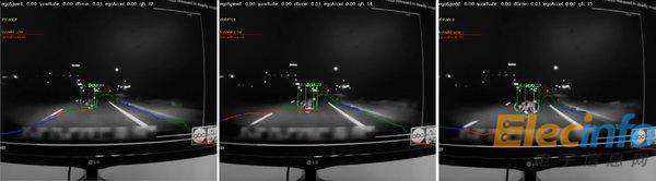 圖像來(lái)源于警方公布的TV監(jiān)視器上的視頻片段。重疊的圖像顯示了Mobileye ADAS系統(tǒng)的響應(yīng)。綠色和白色邊界框是自行車(chē)和行人檢測(cè)模塊所輸出的結(jié)果。水平圖顯示了道路和障礙物之間的邊界,我們稱(chēng)之為“自由空間”。