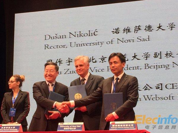 北京師范大學(xué)副校長(zhǎng)周作宇、塞爾維亞諾維薩德大學(xué)校長(zhǎng)杜山·尼科利奇、網(wǎng)龍網(wǎng)絡(luò)公司CEO熊立博士出席了協(xié)議簽署儀式。