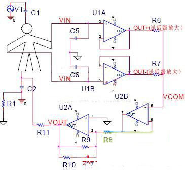 U2A和R9,R10,R11,C7共同組成了右腿驅(qū)動(dòng)電路,其原理是通過R6,R7從人體取出共模電壓反向加到人體。下面我們通過公式來說明對(duì)消驅(qū)動(dòng)的作用,計(jì)算中忽略C5,C6,1A,U1B 的誤差對(duì)共模抑制比的影響,同時(shí)R10和C7是為了系統(tǒng)穩(wěn)定而設(shè)計(jì)的,不影響低頻時(shí)共模抑制比的計(jì)算,計(jì)算時(shí)忽略,公式推導(dǎo)如下: