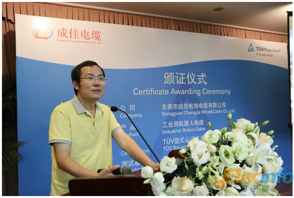 國際領(lǐng)先的第三方檢驗、檢測和認證機構(gòu)德國萊茵TUV集團(以下簡稱“TUV萊茵”)在新興機器人制造基地廣東東莞為東莞市成佳電線電纜有限公司(以下簡稱“成佳電纜”)頒發(fā)了國內(nèi)首張機器人電纜 TUV Mark 完整型式認證證書,以及 TUV萊茵授權(quán)實驗室證書。東莞市機器人協(xié)會秘書長陳永剛先生以及來自各大機器人生產(chǎn)企業(yè)、智能裝配企業(yè)的嘉賓代表共同出席了頒證儀式。