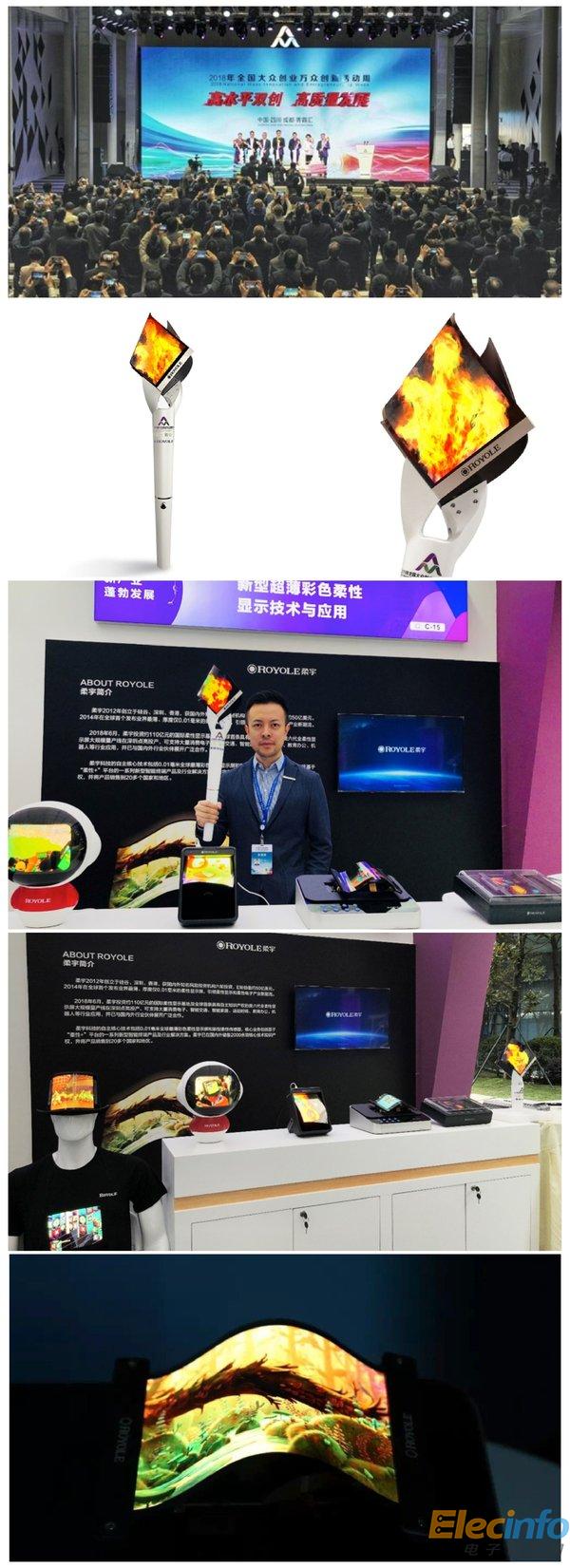 10月9日,2018年“全國大眾創(chuàng)業(yè)萬眾創(chuàng)新活動周”(簡稱“雙創(chuàng)周”)啟動儀式在成都舉行。上午9時許,出席啟動儀式的7位嘉賓手持柔宇為雙創(chuàng)周特別定制的全柔性屏火炬 -- 柔炬RoTorch出場,輕、薄、柔、艷的顯示屏上高清、明亮的圣火熊熊燃燒,寓意創(chuàng)新夢想點燃。隨著火炬插入啟動裝置,本屆雙創(chuàng)周活動正式啟動。