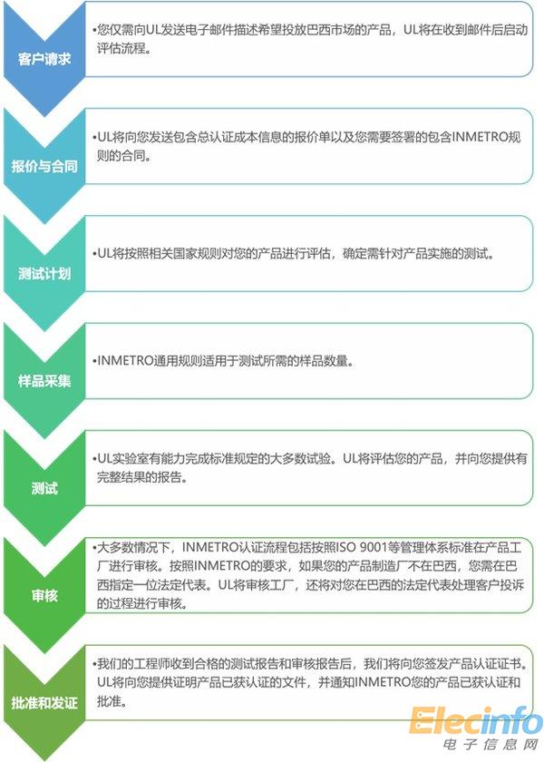 向 UL 巴西申請 INMETRO 認證的總體流程如下,除此之外,UL 還將負責 INMETRO 認證后期的維護,確保產品進入巴西市場前后每一個環(huán)節(jié)都將有我們的全球專家與您無縫對接: