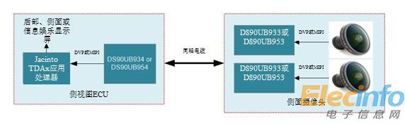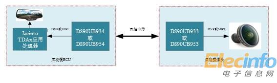 從車輛后方來看,成像器的視頻數(shù)據(jù)輸入到TI的DS90UB933并行接口串行器或具有攝像串行接口(CSI)-2的DS90UB953串行器。然后將這些數(shù)據(jù)通過平板顯示器(FPD)-Link III同軸電纜串行到DS90UB934或DS90UB954解串器,然后輸出到應(yīng)用處理器進行視頻處理(例如JacintoTM TDAx處理器),然后顯示在后視鏡顯示屏上。如果顯示屏遠離Jacinto應(yīng)用處理器,則需要顯示接口串行器和解串器將數(shù)據(jù)通過同軸電纜再次路由。您可以分別使用DS90UB921和DS90UB922紅綠藍(RGB)格式串行器和解串器,或者,如果您要應(yīng)用更高分辨率的顯示屏,則可以使用DS90UB947和DS90UB948開路低壓差分信號顯示接口(LDI)器件。