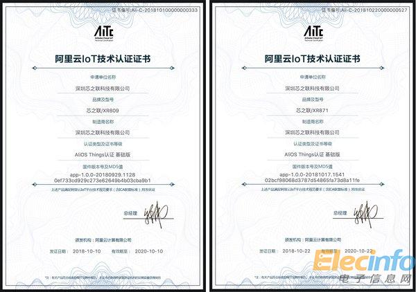芯之聯(lián)芯片通過阿里IoT技術(shù)認(rèn)證證書