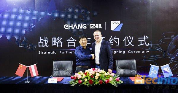 FACC CEO Robert Machtlinger(右) 與億航創(chuàng)始人、董事長、CEO胡華智簽署戰(zhàn)略合作協(xié)議