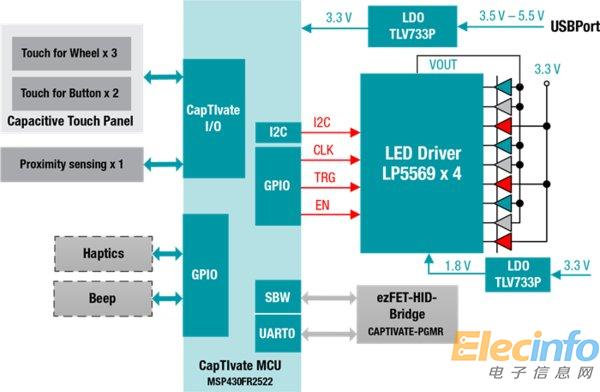 圖 1:電容式觸控和LED動畫參考設(shè)計的框圖(圖片來源于德州儀器)
