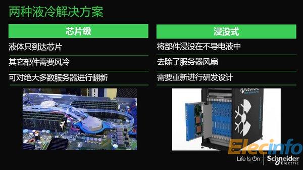 冷卻液對于實現(xiàn)液冷的應用非常的關鍵,我們認為關于冷卻液的討論主要集中在冷卻液的價格、與IT設備的兼容性,還有傳熱特性,對環(huán)境的影響,以及需要要從整個生命周期的角度去考慮問題。如果想要在數(shù)據(jù)中心進行大規(guī)模液冷的部署,必須要克服的幾個問題包括需要對服務器主板進行重新的設計,另外一個就是需要對數(shù)據(jù)中心從系統(tǒng)的角度進行重新的設計,尤其是數(shù)據(jù)中心的供配電系統(tǒng),當機柜功率密度高達幾十個千瓦時怎么來進行供配電的設計,這是一個非常具有挑戰(zhàn)性的思考。