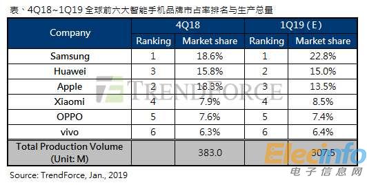 4Q18~1Q19 全球前六大智能手機品牌市占率排名與生產(chǎn)總量