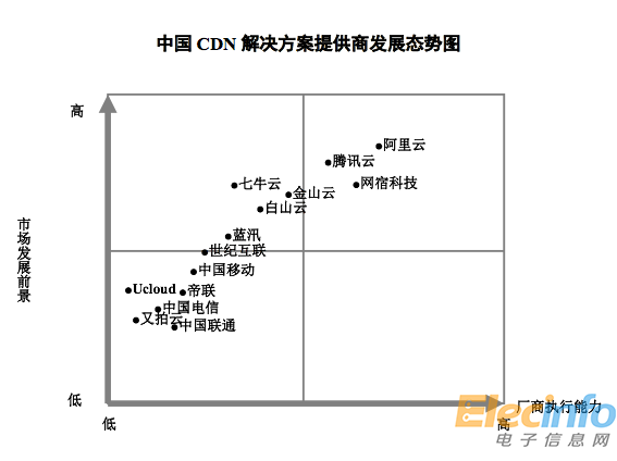 根據(jù)評(píng)估結(jié)果,得出中國(guó)CDN解決方案提供商發(fā)展態(tài)勢(shì)象限圖。報(bào)告中顯示,七牛云融合CND憑借高效率以及低成本的優(yōu)勢(shì),在發(fā)展態(tài)勢(shì)象限圖中發(fā)展前景廣闊。