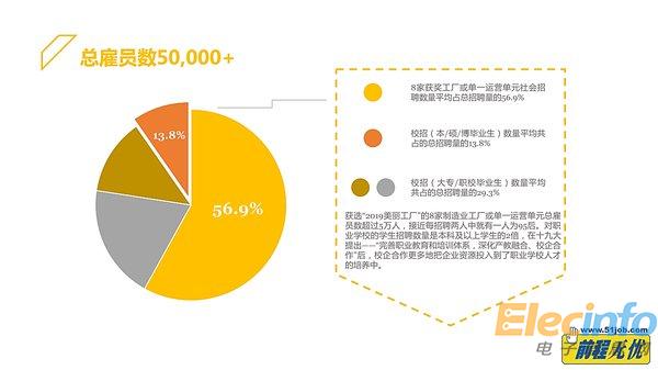獲選“2019美麗工廠”的8家制造業(yè)工廠或單一運營單元總雇員數(shù)超過5萬人,過去三年每年的招聘量同比增速不低于5.8%,校招(包含大學(xué)、職校畢業(yè)生)數(shù)量平均共占總招聘量的43.1%,即接近每招聘兩人中就有一人為95后。對職業(yè)學(xué)校的學(xué)生招聘數(shù)量是本科及以上學(xué)生的2倍。