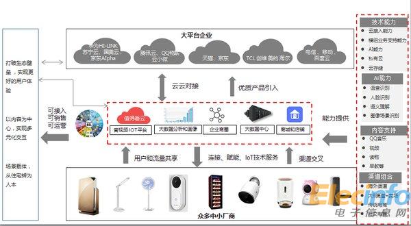 首先從上游來講,理想的智能家居產業(yè)是打破不同生態(tài)間的壁壘,產品互聯(lián),協(xié)議互通,達到消費者的無感知體驗,和國內外主流物聯(lián)網(wǎng)平臺對接,混合各大云服務商優(yōu)勢,滿足客戶同時接入多平臺需求,目前值得看云已和騰訊云、華為、蘇寧、移動等生態(tài)企業(yè)達成深度戰(zhàn)略合作,實現(xiàn)云云對接,協(xié)同共享。
