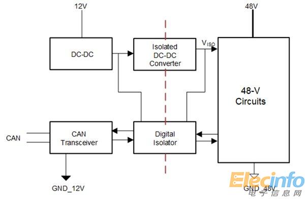 可通過多種方式實現(xiàn)電流隔離,并在系統(tǒng)內(nèi)的不同位置繪制隔離邊界。圖2所示為一種在CAN接口實現(xiàn)隔離的通用方法。在CAN接口與系統(tǒng)中的其他地方隔離具有使用最少數(shù)量的隔離通道的優(yōu)點 -- 僅需兩個隔離通道即可。這降低了成本和電路板空間。