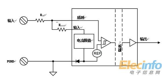 隔離數(shù)字輸入充當(dāng)提供從傳感器輸入或其他輸入類型到主機(jī)控制器接口的邏輯輸出的電流隔離的基本功能。與數(shù)字隔離器不同,隔離數(shù)字輸入的輸入級(如圖2所示)包括用戶設(shè)置輸入閾值和集成電流限制,允許9V至60V范圍內(nèi)的輸入電壓轉(zhuǎn)換為邏輯輸出。在最簡單的形式中,隔離數(shù)字輸入用作隔離比較器,具有一些易于設(shè)計(jì)的附加功能。