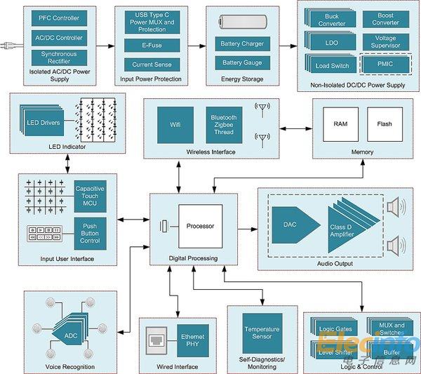 由于這些音箱通常放置在床頭柜或書桌上,交流電源可輕松獲得,因此電池電源并非是必不可少的。但是,考慮到這些音箱的位置,增加電池充電功能則具有重要意義,可以通過(guò)USB或無(wú)線方式為智能手機(jī)和智能手表充電。最后,消費(fèi)者需要可以在這些位置連接并控制燈光、恒溫器和安防系統(tǒng)。