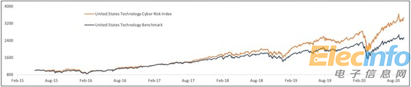 Solactive根據(jù)BitSight衡量的網(wǎng)絡(luò)安全表現(xiàn)創(chuàng)建了由前25%的公司組成的五個(gè)網(wǎng)絡(luò)風(fēng)險(xiǎn)指數(shù)。美國(guó)市場(chǎng)、歐洲市場(chǎng)、發(fā)達(dá)市場(chǎng)和亞太市場(chǎng)的網(wǎng)絡(luò)風(fēng)險(xiǎn)指數(shù)版本均顯示出類似的情況,他們每年均確實(shí)優(yōu)于各自基準(zhǔn)表現(xiàn)約1%至2%。在美國(guó)技術(shù)市場(chǎng)方面,網(wǎng)絡(luò)風(fēng)險(xiǎn)指數(shù)每年優(yōu)于基準(zhǔn)達(dá)7%。