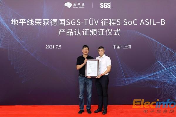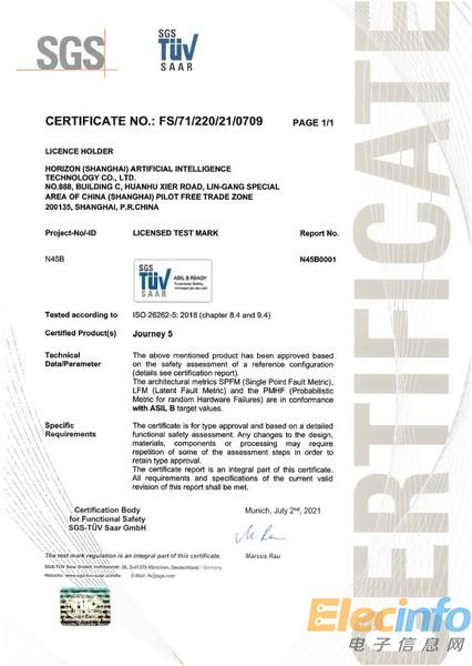 上海2021年7月6日 /美通社/ -- 2021年7月5日,地平線正式宣布征程5芯片成功通過(guò)SGS-TUV ISO 26262 ASIL-B功能安全產(chǎn)品認(rèn)證。全球知名的檢驗(yàn)、鑒定、測(cè)試和認(rèn)證機(jī)構(gòu)SGS TUV Saar(全球功能安全技術(shù)中心)向地平線頒發(fā)證書(shū)。