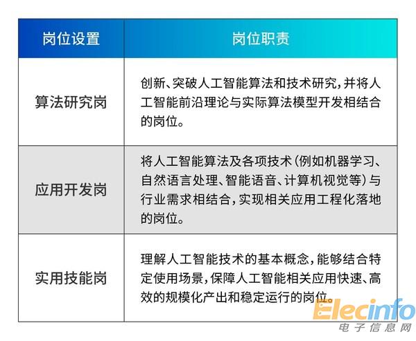 根據(jù)各人工智能企業(yè)崗位人才需求,可歸納為高級(jí)管理崗、高端技術(shù)崗、算法研究崗、應(yīng)用開發(fā)崗、實(shí)際技能崗、產(chǎn)品經(jīng)理崗等類型崗位。