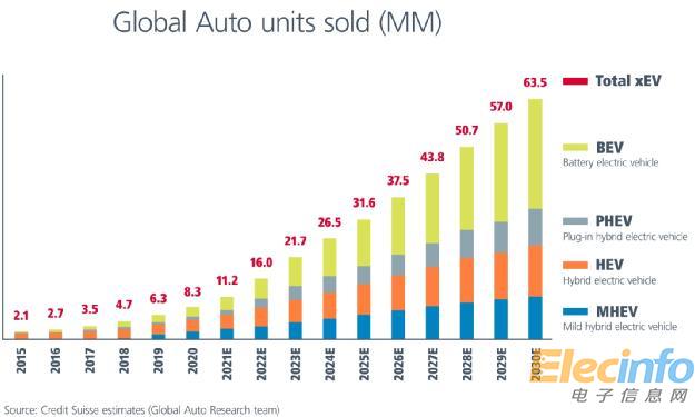 多年來,電動汽車的產(chǎn)量不足全球汽車總產(chǎn)量的 1%。瑞士信貸全球汽車研究中心團(tuán)隊(duì)數(shù)據(jù)顯示,這一比例將從 2020 年的 11% 飆升至 2030 年的 62%,全球汽車銷量將達(dá)到 6,300 萬輛。其中近一半(2900 萬)有望全面實(shí)現(xiàn)電氣化。