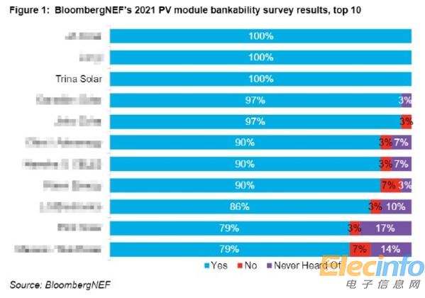 BNEF以公司的財務健康狀況、光伏組件在項目上的跟蹤數(shù)據(jù)以及制造廠商的質保為重要評估指標,向全球銀行、基金、工程總承包以及獨立發(fā)電廠等機構發(fā)送調查問卷,并與質量檢測及技術專家進行深度訪談,調查覆蓋范圍廣,評估公開透明。BNEF是全球新能源市場最具公信力的第三方研究機構之一,其報告長期以來是眾多金融機構在商業(yè)信貸方面的重要參考依據(jù)。