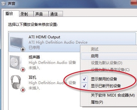 在獨(dú)顯模式下,有時(shí)同樣無法聽到聲音,此時(shí)需右鍵點(diǎn)擊任務(wù)欄小喇叭,選擇“播放設(shè)備”選項(xiàng)(如圖1),右鍵單擊窗口空白處,選擇“顯示禁用的設(shè)備”(如圖2)。
