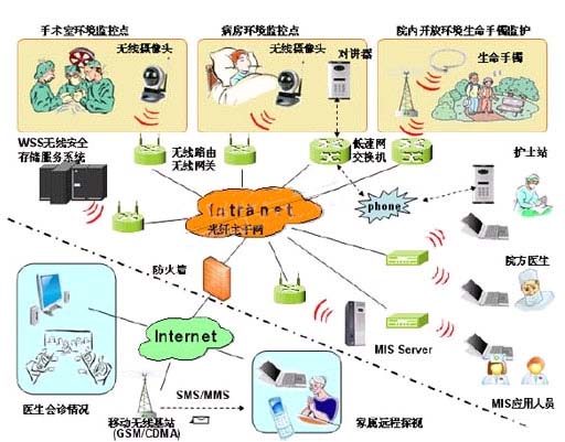 通過構(gòu)架寬帶無線局域網(wǎng)(WIFi),以802.11作為無線連接協(xié)議,支持互連協(xié)議DLNA、IGRS,甚至UPnP,支持采用支持無線寬帶路由的視頻監(jiān)控設(shè)備,在病房指定監(jiān)護點內(nèi)設(shè)置無線攝像頭,通過無線路由器將圖象傳輸?shù)阶o士站的監(jiān)控屏,從而方便醫(yī)生、護士在與病人對講時,還能觀察到病房內(nèi)病人的實際情況,進行實時監(jiān)控;同時,配置的無線安全存儲系統(tǒng)(WSS)可以自動接收通過無線傳輸?shù)膱D象,以便值班醫(yī)生和主治醫(yī)生可以非現(xiàn)場了解病人的病情和狀態(tài),甚至可以通過互聯(lián)網(wǎng)取得需要的實時圖象,檢索和查詢歷史圖象。系統(tǒng)還可以根據(jù)醫(yī)生要求,通過無線方式,對病人增加多個監(jiān)控點,進行靈活按需監(jiān)控。圖中的設(shè)備均留有與局域網(wǎng)的接口,可以通過有線的方式接入網(wǎng)絡(luò),形成多種解決方案,并可與醫(yī)院現(xiàn)行的醫(yī)院信息管理系統(tǒng)、移動通信、互聯(lián)網(wǎng)有機融合。