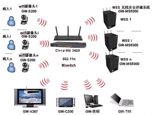 可配置支持無線的LCD大屏幕或若干PC作為監(jiān)控主機,通過瀏覽器或監(jiān)控管理軟件,進行全面的醫(yī)療視頻監(jiān)控管理。 院、科室醫(yī)生在監(jiān)控中心,或在各自的辦公室,通過有線或無線網(wǎng)絡(luò),用顯示屏、計算機或手持無線移動電視終端監(jiān)控各場景。配置無線安全數(shù)據(jù)存儲陣列硬盤(WSS),完成監(jiān)控圖像接收、錄制和存儲。單臺WSS可以對80路音視頻進行同步存儲??梢栽诖鎯χ鳈C上按設(shè)定的時間計劃收錄。單臺無線集線器ME3400 可以接入256個設(shè)備,單臺WSS可以接入32個設(shè)備。在實際的應(yīng)用環(huán)境下,單臺ME3400可以接入50個設(shè)備,可以接入3臺WSS。
