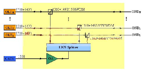 圖1為目前應用較廣的一種基于PON結構的FTTH方案,應用wavelength division multiplexing(WDM)技術實現(xiàn)上行1310nm波段、下行1490nm波段和廣播CATV 1550nm波段信號光的單纖傳輸,并使用time-division multiple access(TDMA)實現(xiàn)多用戶的帶寬共享。