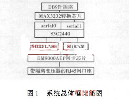 筆者選用Linux 作為實(shí)時(shí)操作系統(tǒng),并進(jìn)行移植與配置使其可以運(yùn)行在以ARM9 為核心的硬件平臺(tái)上。S3C2440A 自帶三路串行通信口,完全能夠滿足多串口服務(wù)器的設(shè)計(jì)要求,但考慮到網(wǎng)絡(luò)數(shù)據(jù)傳輸與串口數(shù)據(jù)傳輸速率不匹配,需要在硬件板卡上擴(kuò)展SDRAM 和NORFLASH,另外系統(tǒng)還需擴(kuò)展以太網(wǎng)控制器芯片。系統(tǒng)的總體設(shè)計(jì)框架如圖1 所示。