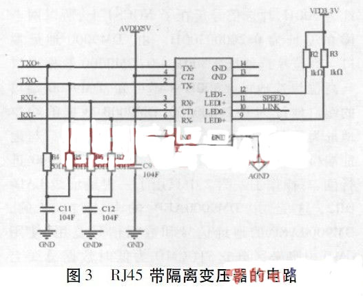 在如圖2 所示的電路中, IOR#管腳接處理器的LnOE 讀信號(hào)端, IOW#接處理器的LnWE 寫信號(hào)端,CS#片選信號(hào)端接處理器的nGCS4 片選信號(hào),SD0 ~ SD15 分別接處理器的數(shù)據(jù)總線,中斷信號(hào)INT 接處理器的EINT18 管腳,RX +、RX -、TX + 和TX – 分別是兩對(duì)差分收發(fā)信號(hào)線接帶有隔離變壓器的HR911105A 的RJ45 座連接,如圖3 所示。訪問網(wǎng)卡以總線形式實(shí)現(xiàn),網(wǎng)卡的IO 基址為300H,片選信號(hào)接在了NGCS4 上,所以網(wǎng)卡IO 的基址為0x20000300H.由“DM9000 地址端口= 高位片選地址+ 300H + 0; DM9000 數(shù)據(jù)端口= 高位片選地址+ 300H + 4”可知,DM9000 端口的端口地址為0×20000300,DM9000 數(shù)據(jù)的端口地址為0×20000304.S3C2440 通過數(shù)據(jù)端口與地址端口并結(jié)合讀/寫信號(hào)線就可以對(duì)DM9000 進(jìn)行讀、寫操作了。圖2 中只用了一根地址線LADDR2,這是由DM9000AEP 的特性決定的,DM9000AEP 的地址信號(hào)和數(shù)據(jù)信號(hào)復(fù)用,使用CMD 引腳來區(qū)分它們( CMD 為低時(shí)數(shù)據(jù)總線上傳輸?shù)氖堑刂沸盘?hào),CMD 為高電平時(shí)傳輸?shù)氖菙?shù)據(jù)信號(hào)) .訪問DM9000AEP 內(nèi)部寄存器時(shí),需要將CMD 置為低電平,發(fā)出地址信號(hào); 然后將CMD置為高電平,讀/寫數(shù)據(jù)。另外,總數(shù)位寬16 位,兩對(duì)差分接收與發(fā)送信號(hào)線,特別要注意的是:
