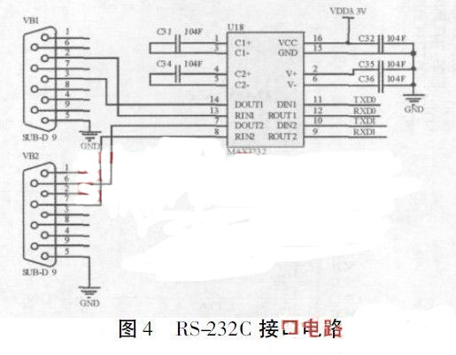 S3C2440 本身自帶三路獨(dú)立的UART 接口,在設(shè)計(jì)嵌入式串口服務(wù)器系統(tǒng)時(shí),應(yīng)用了S3C2440 串口模塊的兩路UART 接口,另外一路UART 接口做開發(fā)時(shí)的打印控制臺(tái)用。這兩路串行口用三線通信,采用MAX3232 作為電平轉(zhuǎn)換芯片,分別配置處理器的GPH2、CPH3、CPH4 和CPG5,4 個(gè)GPIO 口為TXD0、RXD0、TXD1 和RXD1 串口收發(fā)信號(hào)線。RS-232C 接口電路如圖4 所示。