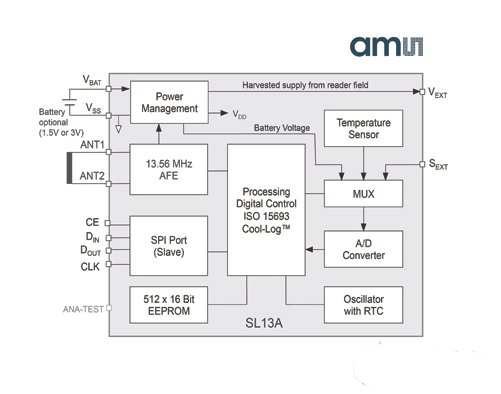 SL13A 和 SL900A可由單電池或3V電池驅(qū)動(dòng)。在電池輔動(dòng)被動(dòng)(BAP)模式下,標(biāo)簽的片上實(shí)時(shí)計(jì)時(shí)器可啟動(dòng)使用,并進(jìn)行周期性的傳感器讀取。SL13A可記錄最多762次事件,SL900A則最多可記錄841次事件,它們都可儲(chǔ)存于芯片中的電可擦除只讀存儲(chǔ)器(EEPROM)。當(dāng)設(shè)備處于閱讀器的可讀取范圍內(nèi)時(shí),這些事件均可被讀取。