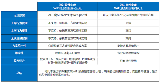 這兩種方法各有優(yōu)劣,但是相對(duì)來(lái)說(shuō),通過(guò)軟件來(lái)實(shí)現(xiàn)WiFi熱點(diǎn)短信密碼認(rèn)證的費(fèi)用更高(大多是按軟件+AP接入許可+短信模塊+PORTAL定制費(fèi)+按裝調(diào)試費(fèi)+每年的服務(wù)費(fèi)來(lái)收取費(fèi)用的),而且先決條件是企業(yè)已經(jīng)搭建了瘦AP+AC的無(wú)線環(huán)境。所以,相比于軟件來(lái)講,筆者推薦通過(guò)硬件來(lái)實(shí)現(xiàn)WiFi熱點(diǎn)短信密碼認(rèn)證。
