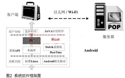 Android是Google與開發(fā)手機聯(lián)盟(Open Handset Alliance,OHA)推出的以Linux為內(nèi)核,真正意義上的開放性移動設(shè)備綜合平臺。從軟件結(jié)構(gòu)的角度上,Android系統(tǒng)分成4個層次: Linux操作系統(tǒng)及驅(qū)動、本地代碼框架、Java框架和Java應(yīng)用程序。圖2為本系統(tǒng)的軟件架構(gòu)圖。多參數(shù)采集前端通過異步串行口與OMAP3530通信,由于Java本身未提供串口的類庫,必須使用JNI(Java Native Interface)實現(xiàn)應(yīng)用層與串口硬件的數(shù)據(jù)傳送。數(shù)據(jù)采集、處理、顯示及網(wǎng)絡(luò)傳輸使用多線程和隊列緩沖機制來保證數(shù)據(jù)的實時性和完整性。網(wǎng)絡(luò)使用C/S架構(gòu),充分發(fā)揮服務(wù)器上的硬件優(yōu)勢,完成更多監(jiān)護信息的顯示和分析。