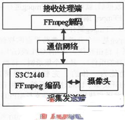 系統(tǒng)是在S3C2440平臺(tái)上運(yùn)行嵌入式Linux系統(tǒng),使用CMOS攝像頭OV9650獲取實(shí)時(shí)視頻圖像數(shù)據(jù),采用H264標(biāo)準(zhǔn)通過(guò)FFmpeg原始視頻進(jìn)行壓縮編碼成視頻流,通過(guò)網(wǎng)絡(luò)傳輸,用戶在接收處理端經(jīng)過(guò)FFmpeg解碼之后,使用OpenCV顯示播放即可實(shí)時(shí)查看遠(yuǎn)程視頻圖像。