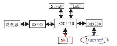 監(jiān)控系統(tǒng)硬件分為核心板和底板2個部分。核心板使用S3C6410處理器,外擴128MBSDRAM和256MBFLASH外部存儲器。底板采用的是RS485采集接口,3線RS232串口,SD卡存儲接口以及以太網(wǎng)控制器和RJ45組成的以太網(wǎng)接口,硬件結(jié)構(gòu)如圖1所示。