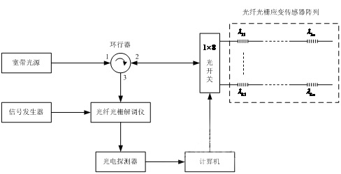 圖1是光纖光柵應(yīng)變傳感監(jiān)測系統(tǒng)的基本構(gòu)成圖。系統(tǒng)中寬帶光源輸出光輸入到環(huán)行器端口1,由端口2輸出到1×8光開關(guān),光開關(guān)的每一路由幾個不同中心波長的光柵串接構(gòu)成傳感陣列。通過不同光纖光柵的反射光波長 …… ,與被測對象上各測量點(diǎn)相對應(yīng),分別感受各分布測點(diǎn)的應(yīng)力應(yīng)變,使其反射光的波長發(fā)生改變,改變的反射光經(jīng)傳輸光纖從測量現(xiàn)場傳出,輸入到環(huán)行器端口2,再由端口3輸出。通過光纖光柵解調(diào)系統(tǒng)探測其波長改變量的大小,并由光電探測器轉(zhuǎn)換成電信號后輸出,最后由計算機(jī)系統(tǒng)對被測對象的狀態(tài)進(jìn)行分析和評估。